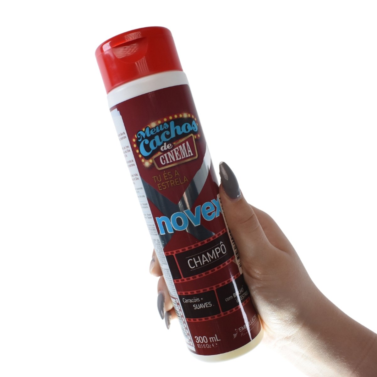 Com os cabelos molhados, aplica o Champô Meus Cachos de Cinema no couro cabeludo e massaja suavemente até formar espuma. Enxagua bem. Para melhores resultados, usa a linha completa Meus Cachos de Cinema da Novex.