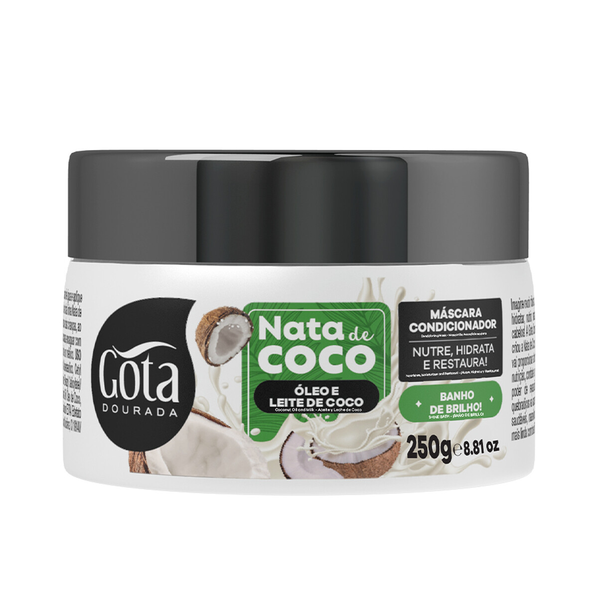 Modo de usar: Após lavar o cabelo com Gota Dourada Nata de Coco Champô Hidratante e Gota Dourada Nata de Coco Condicionador Hidratante, retirar o excesso de água e aplicar em todos os fios massajando suavemente. Deixar atuar por 3 minutos e enxaguar. Para melhores resultados, usar a linha completa Nata de Coco Gota Dourada.