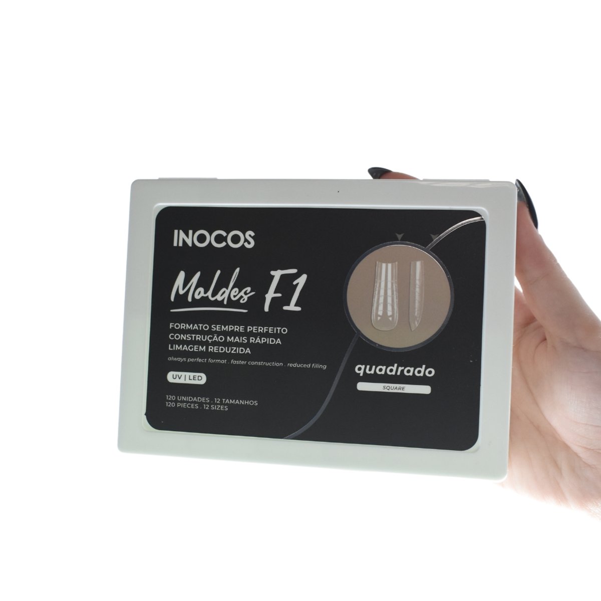 Os Moldes F1 INOCOS em Formato Quadrado garantem um formato perfeito com construção rápida e menos necessidade de limagem. Compatíveis com catalisação LED/UV, são ideais para resultados profissionais. Inclui 120 unidades em 12 tamanhos. Parte da coleção exclusiva com a Nail Designer Carol Carvalho.