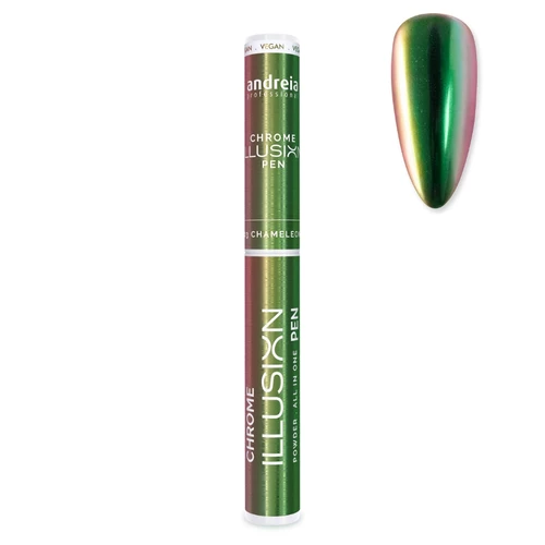 Andreia Chrome Illusion Pen 03 – EAN:5603927884569: Uma caneta de verniz inovadora que oferece um efeito espelhado e cintilante, ideal para criar manicuras únicas e sofisticadas. Fácil de aplicar, proporciona um acabamento cromado duradouro, perfeito para nail art profissional.