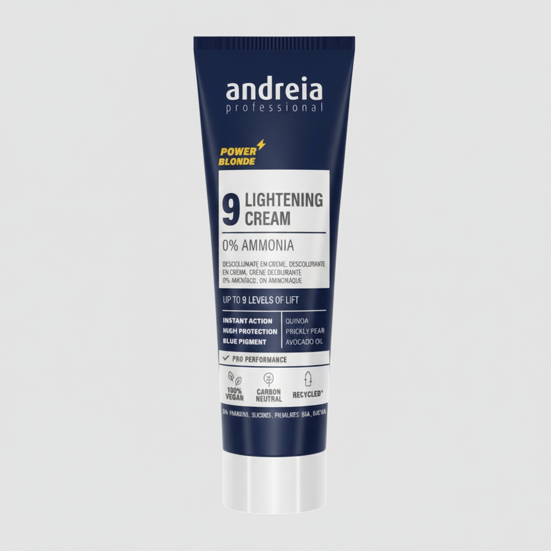 O que é O Vegan Lightening Cream 9 Power Blonde da Andreia Professional é um creme descolorante vegan, ideal para obter tons loiros claros e uniformes.