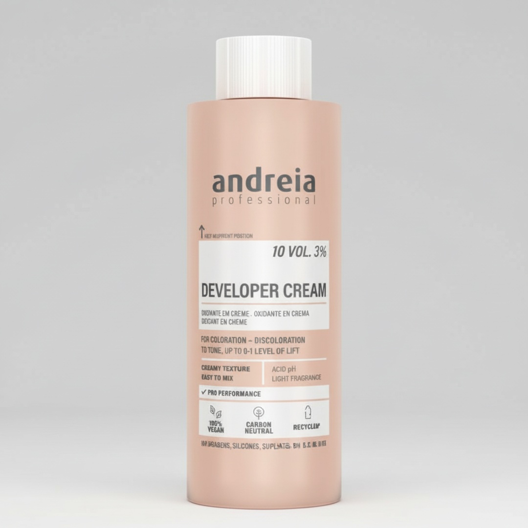 Vegan Developer Cream 10v 150ml Andreia Professional – EAN:5603927883920: Creme oxidante vegan para coloração capilar, ideal para ativar a coloração garantindo resultados uniformes e duradouros. Formulado sem ingredientes de origem animal, é perfeito para uma escolha de beleza ética e eficaz.