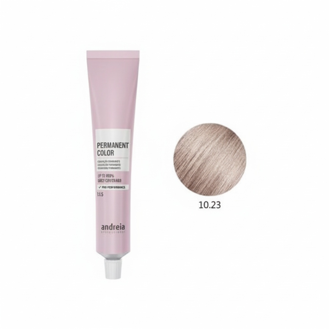 Coloração Vegan Permanente 100ml 10.23 – EAN:5603927881513: Tinta capilar vegan de longa duração da Andreia Professional, ideal para cobertura de cabelos brancos com acabamento profissional. Fórmula sem amoníaco, adequada para couro cabeludo sensível.