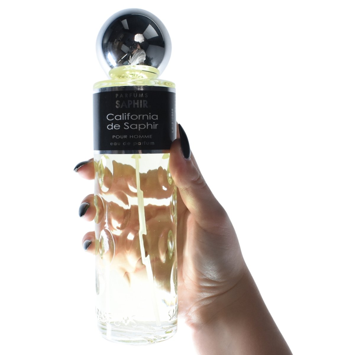 Saphir California começa com cítricos e especiarias masculinas, evolui para notas doces e finaliza com cedro, sândalo, almíscar e um toque marinho. Perfume irresistível e envolvente.