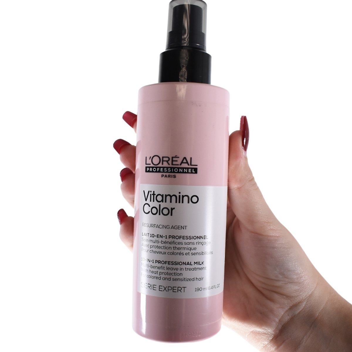O Spray L'Oréal Vitamino Color Leave-In 190ml é um tratamento multibenefícios 10 em 1, perfeito para cabelos com coloração e sensibilizados. A fórmula, com agente reconstrutor, oferece proteção térmica até 230ºC, brilho, suavidade, homogeneidade da fibra, facilidade no desembaraçar e secagem, nutrição, resistência contra quebras, prevenção de pontas duplas e controlo do frizz. Pode ser aplicado antes do corte, secagem ou como finalizador. Aplique em cabelo lavado, húmido ou seco e não enxágue, para um cabelo 3x mais brilhante e até 94% mais resistente à quebra.