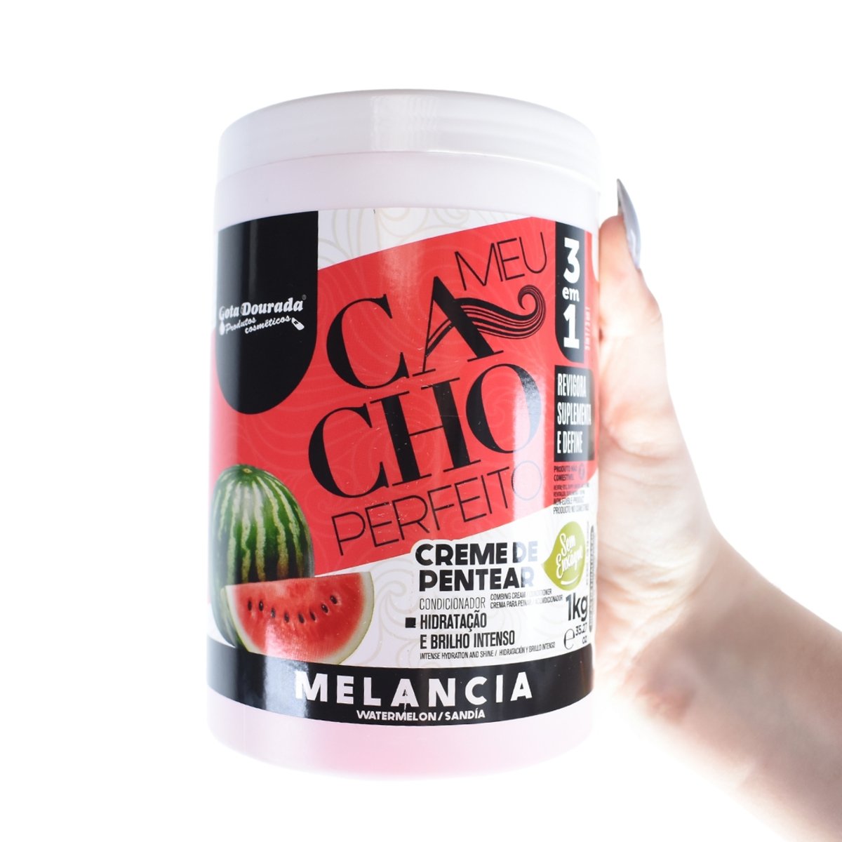 O Creme de Pentear Meu Cacho Perfeito de Melancia da Gota Dourada é o aliado ideal para quem deseja cachos bem definidos, brilhantes e profundamente hidratados. Enriquecido com extrato de melancia, este creme revitaliza os fios, proporcionando um cabelo mais saudável, nutrido e livre de frizz.