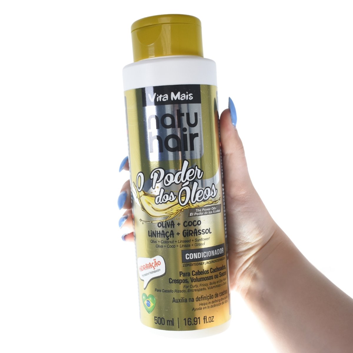 1️⃣ Após lavar o cabelo com o Shampoo NatuHair O Poder dos Óleos, aplica o condicionador nos fios húmidos.