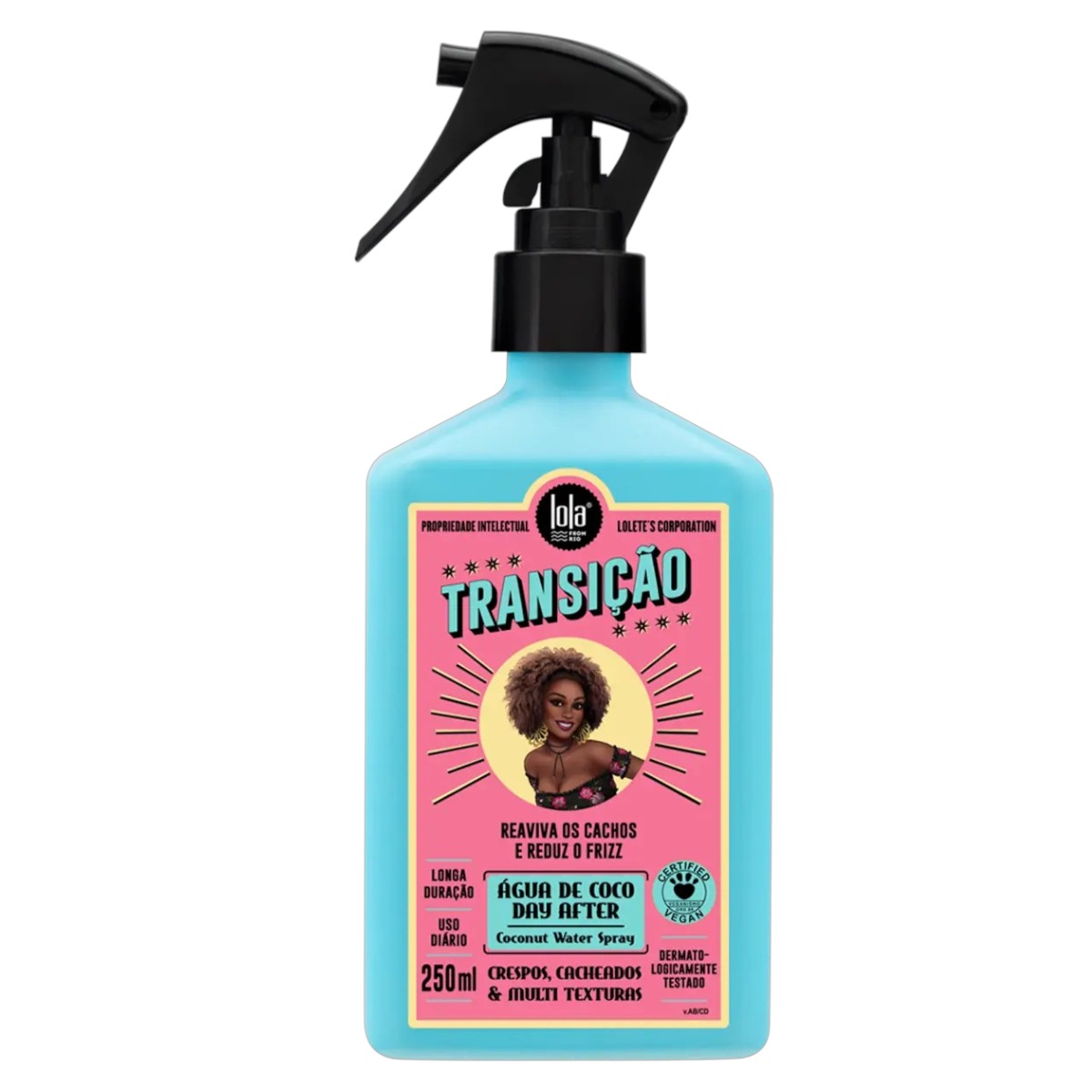 Lola Cosmetics Transição Água De Coco Spray para o dia seguinte. Hidrata, devolve a humidade e revitaliza os seus cachos, facilita a remodelagem e reduz o frizz. Tudo que precisa para a sua transição. Com ativo patenteado para estimular o crescimento é perfeito e vai ajudar o seu cabelo a crescer mais forte e resistente.